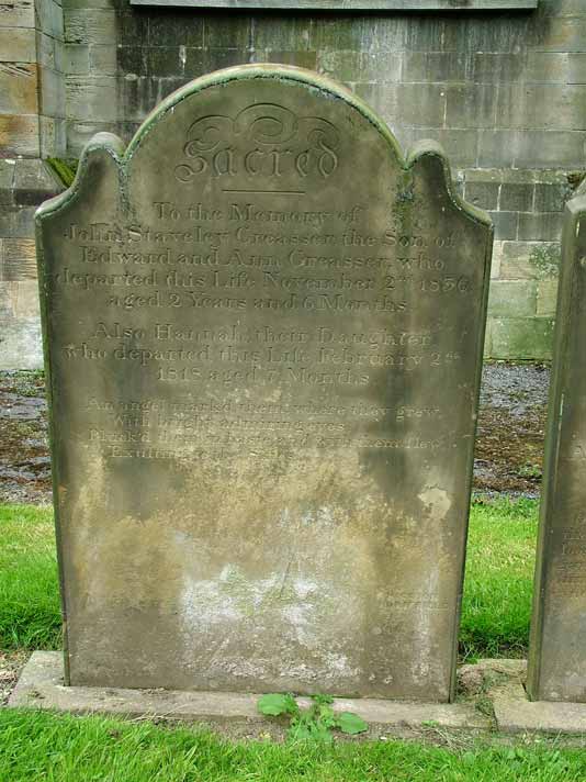 Sacred to the memory of John Staveley Creasser, the son of Edward and Ann Creasser, who departed this life November 2nd 1836 aged 2 years and 6 months. Also Hannah their daughter, who departed this life February 2nd 1818 aged 7 months. An angel marked them where they grew, with bright admiring eyes. Plucked them with haste and with them flew, exulting to the skies.