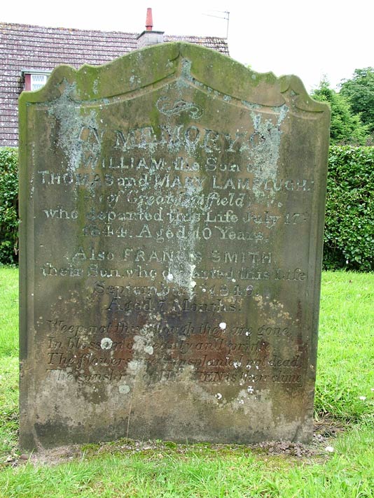 In memory of William the son of Thomas and Mary Lamplugh (of Great Driffield) who departed this life July 17th 1844 aged 10 years. Also Francis Smith their son who departed this life September 1st 1846 aged 7 months. Weep not thus though they are gone. In blossom of beauty and prime. The flowers are transplanted not dead. The sunshine of heaven is their clime.