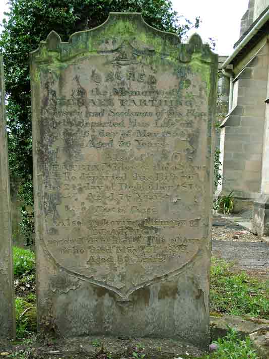Sacred to the memory of Michael Farthing nursery and seedsman of this place who departed this life on the 16th day of May 1854 aged 56 years. Also Beatrix widow of the above who departed this life on the 24th day of December 1876 aged 76 years. Rest in peace. Also in loving memory of Beatrice second daughter of the above who died May 31st 1899 aged 65 years. ( Lived at Trout Stream Cottage - demolished 2015).