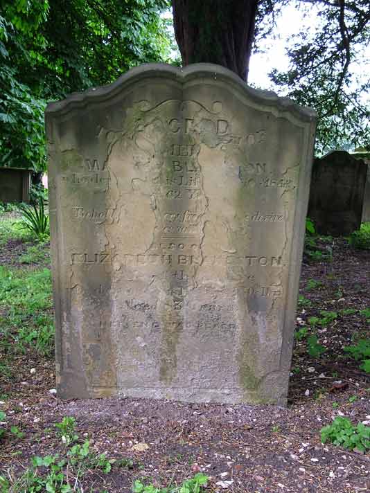 Sacred to the memory of Ma ? Blakeston who departed this life ? ?0th 1842 aged 62 years. Verse eroded. Also of Elizabeth Blakeston wife of the above who departed this life ? 30th 1870 aged 83 years. Her end was peace.