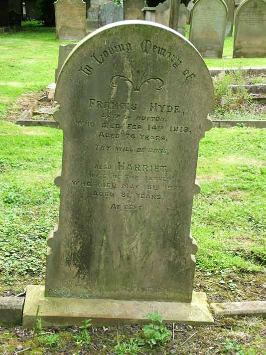 In loving memory of Francis Hyde late of Hutton who died Feb 14th 1918 aged 74 years. Thy will be done. Also Harriet wife of the above who died May 16th 1927 aged 81 years. At rest.
